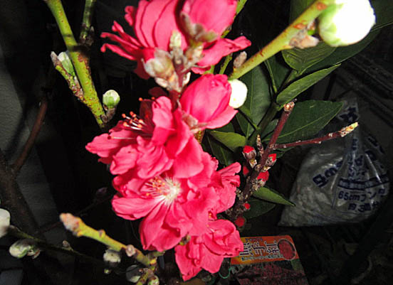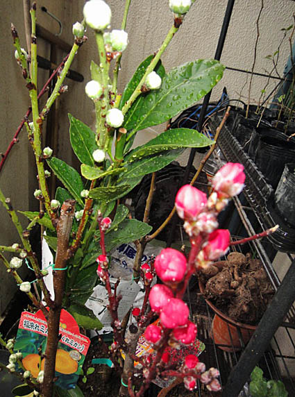JUGEMテーマ:趣味の園芸 今朝、窓先で栽培している、花桃の苗に蕾が出来ていました。 花も、赤、白、ピンクの3種類の苗を購入していたので、違う色の蕾ができていました。 珍しい、蟠桃という平たい形の桃の実がなる苗の蕾も成長してきました。
