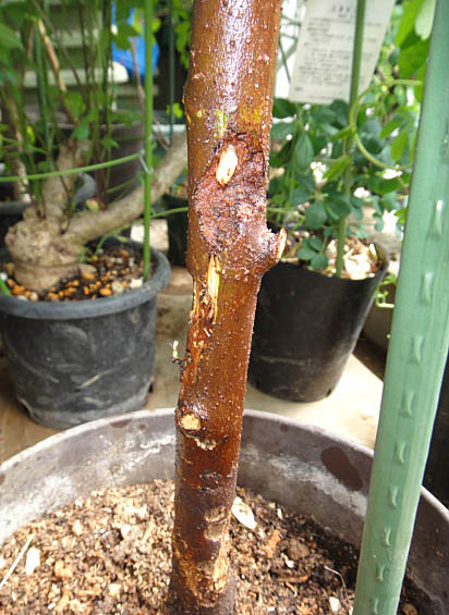 JUGEMテーマ:趣味の園芸 午前中、植木の苗を知り合いに寄贈するため、窓先の植木を整理していたら、イチジクのロングドゥート の苗からおが屑のようなものが落ちていました。 幹の数か所から押し出されたようで、カミキリ虫の幼虫が幹の中にいるようです。 虫が食い散らかした部分は、柔らかくなっているので、除去し食い散らかした穴に駆除用のノズルスプレー殺虫剤を充填。 虫も苦しくて、穴からニヨッキと、出てきました。 この後、イチジクも枯れないで実がなるのか心配です...