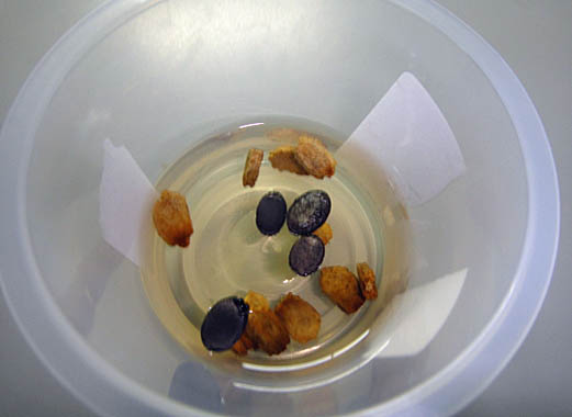 JUGEMテーマ:趣味の園芸 前の年に、栽培用に種を確保していたので、今年も願寿ゴーヤを育てるため、種を一晩水に浸けておきました。 黒い種は、へちまの種です。 ゴーヤの種はこの後、表面の硬い殻をとり、保温器でしばらく保温予定です。 昨年は保温器にサーモスタットを設置できなかったので、一部煮豆風になって発芽成長できませんでした。 今年は、別販売のグリーンサーモという装置を購入したので、試してみます。 昨年、札幌に帰った時に入手した、野ブドウの種も発芽させます。 野...