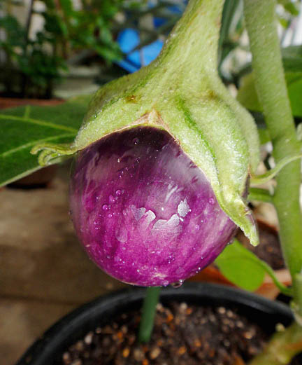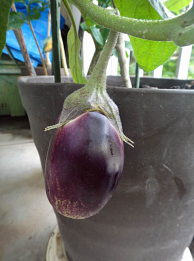 JUGEMテーマ:趣味の園芸 早朝、窓先で栽培している水茄子の鉢になっている茄子の実を採取。 株の下の方の実は大きくなる前にヘタから脱落してしまうので、今回も摘果も含めて採取しました。