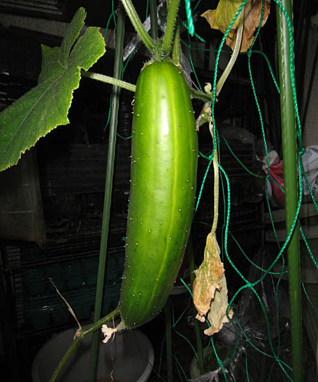 JUGEMテーマ:趣味の園芸 窓先でしているキュウリも弦の先に出ていた葉が弱って変色してきています。 新しい弦が伸びて実が付きましたが、細長くなく、へちま調にずんぐりとして伸びません。 適当な時間に採取が必要なので今朝採取しました。