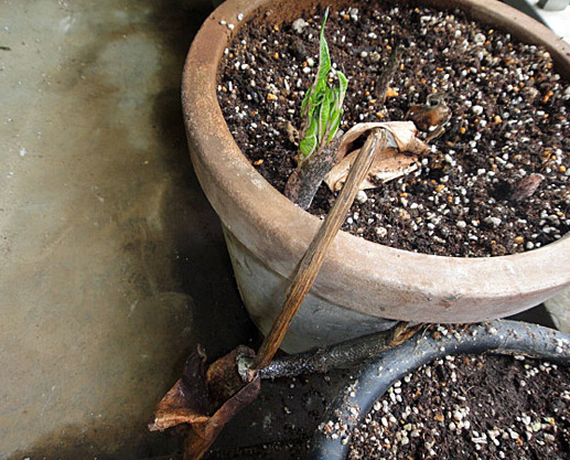 JUGEMテーマ:趣味の園芸 窓先で栽培しているコンニャク芋も花が枯れて、グテ〜ンと倒れています。 山ブドウの鉢にも、カマキリが乗っていました。