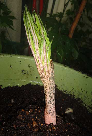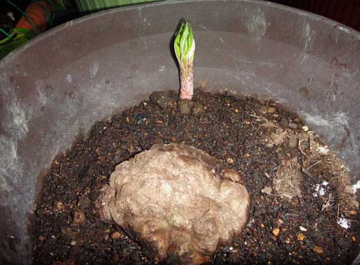 JUGEMテーマ:趣味の園芸 窓先のこんにゃく芋を夕方見てみたら、角状の芽から葉っぱのようなものが出てきました。 手前に見える、カメの甲羅状のものは花を咲き終えた後の種芋です。 芽が出てきた位置が鉢の縁というのがよろしくありません。 成長が早くなるように、万田酵素の液体肥料を定期的にあげようと思います。