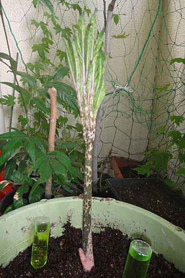 JUGEMテーマ:趣味の園芸 自宅のこんにゃく芋から伸びた芽は、いよいよ大きくなってきており、魔女のホウキのようになっていました。 上から見ると、緑の葉が詰まっています。 窓先のゴーヤのカーテンも葉が茂ってきました。 ゴーヤの葉も虫に食べられている部分もあり、下に何かの糞もボトボト落ちていたので葉をよく見てみたら、弦先でクネクネしているモノが。 キモイ。。。。('Д`lll) !! ここのとこ...