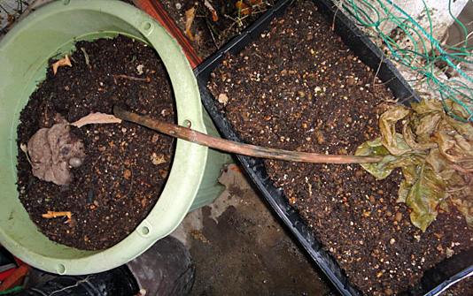 JUGEMテーマ:趣味の園芸 窓先のポットで栽培していた、こんにゃく芋も葉が枯れてきており、ぐて〜んとしおれてきました。 種芋部分に新しい生子が出来ているようなので、また来年に芽が出てくると思われます。