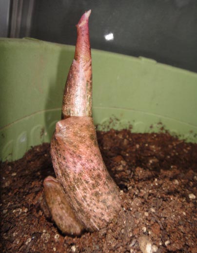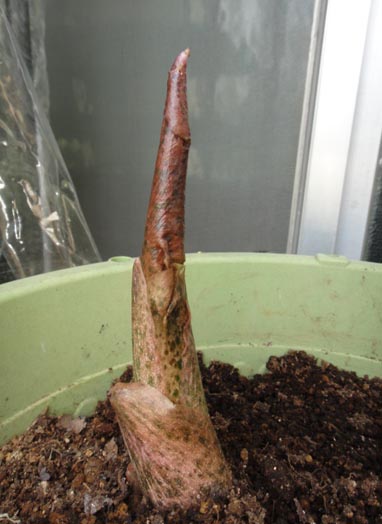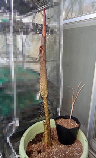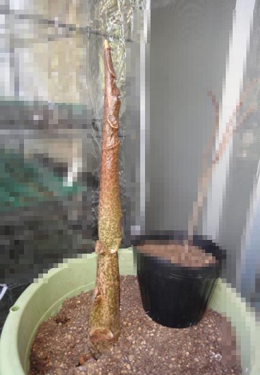 JUGEMテーマ:趣味の園芸 茨木の真壁で食用に販売されていた、こんにゃく芋を購入し大き目のポットに植えていました。 こんにゃく芋は、病気になりやすく、溶けてドロドロになるので本来は消毒が必要らしいです。 今回は消毒しないで、芋を45度に傾けて植えました。 こんにゃく芋のてっぺんは窪んでいるので水が溜まり腐りやすいそうです。 斜めに出ていた芽も上空へ反り上がって、ニヨキ〜っと伸びてきました。 生乾きのタオルのような匂いが発生しています。