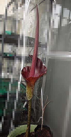 JUGEMテーマ:趣味の園芸 ポットに植えていた、こんにゃく芋も花が咲いてきました。 花も生ゴミのような、匂いを放っています。 昔の水木しげるの漫画で描かれていた、マンモスフラワー風です。 チョコレート色の、ポーポーの花も咲いています。