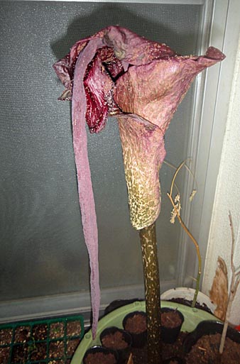 JUGEMテーマ:趣味の園芸 ポットに植えていた、こんにゃく芋も花が今朝になり、グデェ〜ンと、しおれてきました。