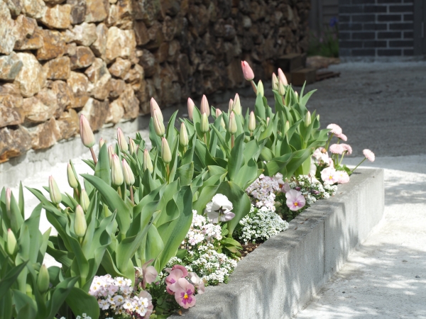 こんにちは♪ 昨年末会社入口のコーナーに植えたピンクのチューリップがこの陽気でいっきに成長してきました。 次回のブログではきっと咲いている様子が報告できることでしょう♪ ゲートをあけて真っ先に目にするここのコーナー、チューリップの他に デイジー、アリッサム、パンジーが植わっています♪ 毎年埼玉県の造園業者様から何千球というチューリップ球根の注文をいただきます。 ある地元の幼稚園での取り組みらしく毎年園児たちも一緒に植えこむのだそうです。 素敵な幼稚...