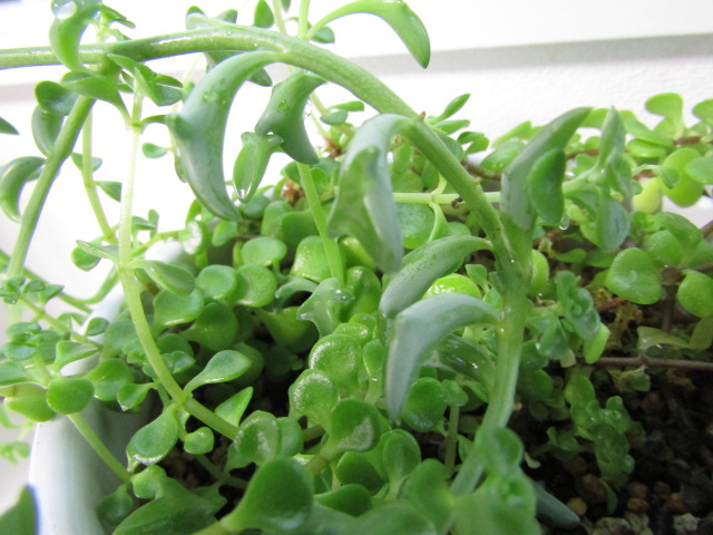 ドルフィンネックレス セネシオ属の多肉植物「セネシオ・ペレグリヌス」 通称=ドルフィンネックレス イルカが連なって まるで跳ねているか(笑)の様な葉の 形が特徴の希少価値の多肉植物 さっちゃんに頂いて大事に育てています ...んんがぁ〜 何故か??? 育っていくうちに ツル状の垂れ下がった葉から イルカのヒレの部分が消えちゃった(>_