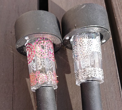 JUGEMテーマ:ガーデニング 停電の時、辺りが真っ暗なのは心細いので、ソーラーパネルのライトが欲しいと思ってました。 そこで、100均で購入したのですが、明かりがあまりにも心もとない。 金額を上げれば、可愛らしい装飾のライトが手に入るけど、数が多いのでそこまでは出来ない。 ってことで。。。 100均のマスキングテープを貼り付けてみました。 レース模様なのでプチプチ切れまくって貼るの大変(笑) ついでに中の電池も交換。 夜になると、こん...