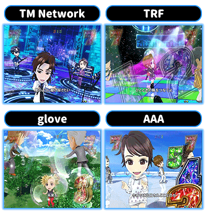 キャラSPリーチ ■TM Network・TRF・globe・AAAの4アーティストの2Dキャラが繰り広げるSPリーチ。ノーマルロング的なものなので、期待度は低め。発展しないと当てるのは難しそう。 実写SPリーチ ■「キャラSPリーチ」から発展すれば期待度アップ。 「I am 」「 Get Wild 」「寒い夜だから」など、おなじみの楽曲が実写で展開される。期待度はそこそこといったところだ。 Live SPリーチ ■本機種でもっとも期待できるスーパーリーチで、実際のLive映像がヒット曲とともに流れる。4グループそれぞれの大ヒット曲で展開さ...