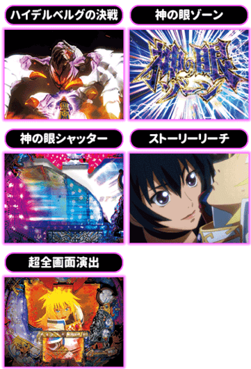 5大注目演出 ■大当たりに必ずといっていいほど絡む5大演出。 「ハイデルベルグの決戦」は期待度65%! 特殊ゾーン先読み「神の眼ゾーン」もアツい。 「神の眼シャッター」から「ストーリーリーチ」や「超全画面演出」が展開されたら激アツ。 これらは単独でも十分チャンスだが、2つ以上複合していれば激アツの展開が約束される。 特に役物の「神の眼シャッター」は様々な場面で可動し、期待度をぐんと上げてくれる。 ゲームのポイント ■「通常時」から特殊ゾーン演出などを経て大当たりすれば大当たりラウンドで「ヒュ...