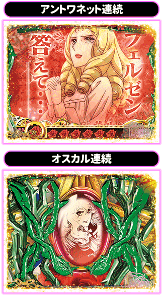 ベルばら連続予告 ■連続演出となるこのアクションは続けば続くほどチャンスとなる。パターンは「アントワネット連続」と「オスカル連続」がある。いったん途切れた!?と思いきや連続することもあり、目が離せない。 とりあえず3回以上の継続を期待! ローズチェイン ■画面の液晶に表示されるポイントが貯まるほど、確変図柄が増えるという斬新なシステム。先読みのアクションとも言える。連続予告と絡むとチャンス! ローズメモリー ■液晶画面いっぱいに弾け散る花びらがエキサイティングだ。先読みアクションの基本...
