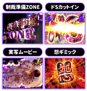 4大お仕置きチャンス ■大当たりに絡みやすい4つのチャンス演出。まずは「制裁準備ZONE」はZONEに入れば制裁コンプリートの期待が高まる。発生時点で30%程度の信頼度。 「ドSカットイン」は予告やスーパーリーチ時など、さまざまなポイントで発生する可能性がある。期待度は約30%となかなかのもの。 「実写ムービー」予告に登場するだけで期待度がぐんとアップする実写ムービー。原作の名シーンから展開される実写がアツい。 「怨ギミック」は最強役物で、リーチ時などに盤面にこの文字が完成すれば制裁は間近。大当たり時に...