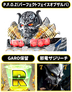 3大チャンス ■大当りに結びつきやすい3大チャンスを把握しておくべし。まずは大迫力の役物アクション「3Dインパクトカットインザルバ」からのP.F.O.Z完成! そして「GARO保留」。赤なら大チャンス。もしレインボーに変化したら超チャンスと言える。 「雨宮SP邪竜ザジリーチ」は出現率も低めで、その分だけ期待度の高いスーパーリーチだ。 ゲームのポイント ■通常時からの図柄大当りは1、2、4、6、8で4ラウンド。3、5、7で6ラウンド以上。ボーナスチャレンジに成功すれば16ラウンド! そしてどちらも、もれなく6回転確変...