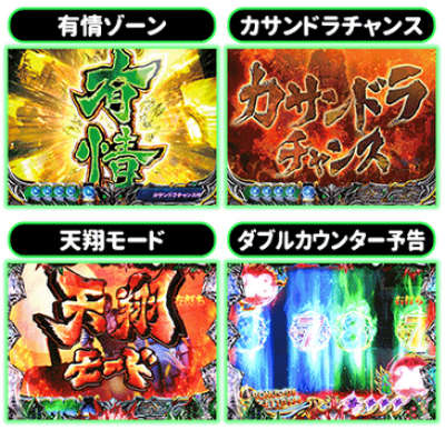 注目演出 ■大当たりに結びつく率が非常に高い注目演出を覚えておこう。まずは「有情ゾーン」。これは本機種から新規に搭載された先読みゾーンで発生した時点で期待度はかなり高い。該当保留が消化される時に強い予告が複合すれば大チャンスとなる。 「カサンドラチャンス」は牢獄に幽閉されたトキを探しだすことができれば、激アツのスーパーリーチに発展する。また「天翔モード」への移行もアツい。カウントダウン発生で期待度アップ。 「ダブルカウンター予告」はダブルで発生する煽り演出。いずれかでもテンパイすれば大チャ...
