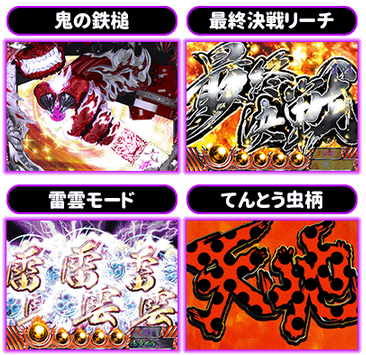 4大鬼演出 ■大当たりに絡みやすい4つの鬼アツ演出をおさえておこう。まずは激アツ役物「鬼の鉄槌」。 最強スーパーの「最終決戦リーチ」。先読みとしては高信頼度の「雷雲モード」。 そしてあらゆるところで出現する可能性がある「てんとう虫柄」。これらが複数絡めばまさに鬼に金棒。とりわけ、「鬼の鉄槌」は大当たり時には必ず絡むと言っても過言ではないアクションとなる。 ほかにも、「鳴きギミック」「和了ギミック」など多彩な動きをみせる役物に期待しよう。 ゲームのポイント ■「通常モード」は高層ビルや雀荘...