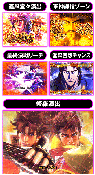 5大注目演出 ■大当たりに絶対と言っていいほど絡む注目の演出をピックアップ。 「義風堂々演出」はタイトルロゴ発生でチャンス!! 「軍神謙信ゾーン」は先読みの中でも抜群の期待度を誇る。該当保留消化が非常に楽しみになる。 修羅演出 元祖『花の慶次シリーズ』のキセル演出と同等のアクションなので激熱だ。本機種最強の演出と言えるだろう。 「最終決戦リーチ」はいわずもがなの最強リーチ。強い予告が伴っていれば鬼アツ。いったんハズれてからの再始動当たりも多いので最後まで期待が持てる。 「堂森回想チャンス」はス...