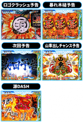 注目演出 ■大当たりに絡む率が非常に高い注目の演出を覚えておこう。 まずは迫力の役物「ロゴクラッシュ予告」源ギミックが割れたら大チャンス必至。「暴れ木槌予告」はチャンス目として【源・7・3】が停止すれば発動する。並びの順番は問わない。 「次回予告」は定番となったスーパーリーチ濃厚演出。図柄変動時に画面暗転予告から発生する。激アツだ! 「山車出しチャンス予告」は山車を出すことができたらストレートに「山車DASHモード」に移行するアツいアクションだ。「源DASH」は継続すればするほどチャンスとなる。炎に...