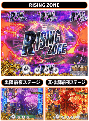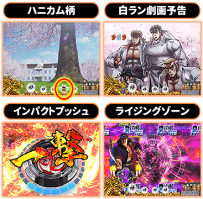 4大演出 ■大当たりに絡みやすい4大演出をチェックしておこう。まずは激アツ図柄「ハニカム柄」。そして「白ラン劇画予告」。どちらも出現率が低く、その分激アツなのだ。 一撃アクションがアツい「インパクトプッシュ」。突入した時点で激アツとなる「RISING ZONE」も見逃せない! ゲームのポイント ■「通常ゲーム」は桜満開や塾庭ステージなどで展開される。真・出陣前夜ステージや「RISING ZONE」などの特殊ステージに移行すれば大チャンスとなる。 「驚邏大四凶殺」などを経て「大将血戦ボーナス」獲得を目指せ。もし「...