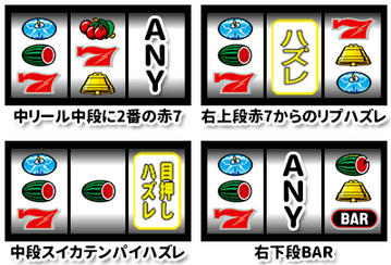 左下段赤7からのリーチ目 ■左リール下段赤7停止時もBIG絵柄の一直線はリーチ目となる。ただし、中リールVと2番の赤7近辺はスイカの取りこぼしポイントでもあるので、狙う際は右リールでスイカでないことを確認するか、中段1コマで目押ししよう(4コマ先にスイカあり)。 中リール中段に2番の赤7が停止する2確目も初代から継承。また、中段スイカテンパイハズレもリーチ目だ。右リールの赤7は上段に停止すればリプレイ or ボーナスとなるが、下段赤7停止はスイカの取りこぼしでも停止するので注意。また、右リール下段13番のBAR停...