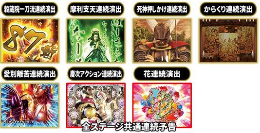 連続演出 ■擬似連となる連続演出をしっかりと押さえておこう。続けば続くほどチャンスとなるのは言うまでもない。その種類は多彩! 「穀蔵院一刀流」「摩利支天」「死神押しかけ」「からくり」「愛別離苦」はそれぞれのステージに合わせて展開される。このほかに「慶次アクション」「花連続」はどのステージでも共通して出現する。 先読み演出 ■玉がスタートチャッカーに入賞した時点で発生する先読み演出は大当たりに絡む確率が高いので要チェック! まずは「保留変化演出」は液晶下部にある保留玉表示が変化する。青&rarr...