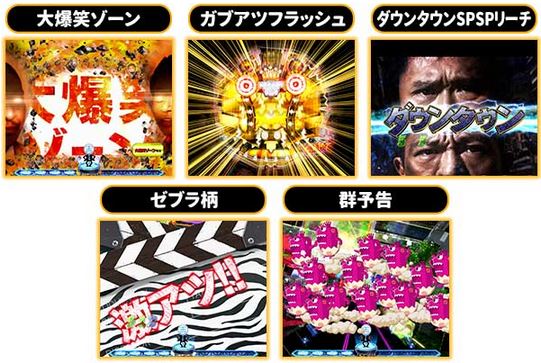 5大笑撃ポイント ■大当たりに絡む重要な演出の数々。2つ以上出現すれば大チャンスと言えよう。特にガブアツフラッシュは大当たりに欠かせないアイテムだ。 お笑いRUSH中の演出 ■お笑いRUSH中はリーチ演出が排除されているため、5つのチャンネルを楽しもう! コントや歌で楽しませてくれるぞ。 時短中の演出 ■時短中はさまざまな専用演出で楽しませてくれるぞ! 中でも、ガブガブキング暴走リーチに発展すれば大チャンスだ。 JUGEMテーマ:ギャンブル JUGEMテーマ:パチンコ