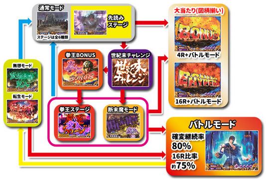 ゲームフロー ■「通常モード」は6つのステージと先読みとなる特殊ステージで構成されている。 モード移行演出の「世紀末チャレンジ」は「拳王ボーナス」または「断末魔モード」へ移行する。後者は電チューサポートは付かないが高確率の可能性がある。 「拳王ステージ」は高確率の可能性が高い電チューサポート状態。電サポ回数は20 or 40 or 60 or 次回まで。バトル発生で大チャンスとなる。 出玉揃いの大当たりの場合は「4R+バトルモード」か「16R+バトルモード」が約束される。 「バトルモード」は確変継続率80...