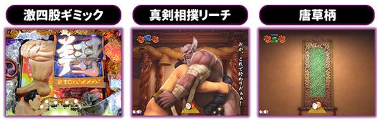 注目演出 ■大当たりに結びつきやすい注目演出はぜひ押さえておきたい。まずは最強の役物「激四股ギミック」。盤面を覆うように出現する力士の四股アクションは出現時点でスーパーリーチ濃厚となり激アツだ。大当たりには欠かせないアクションとなるぞ。 そして「真剣相撲リーチ」は3Dバトルがアツい最強のスーパーリーチ。大当たりに結びつく場合はこのリーチが圧倒的に多い。 豊丸の激アツ図柄は定番となった「唐草柄」。リーチ背景、タイトル文字、キャラなどさまざまなところで出現する可能性があり、大チャンスといっていい...