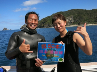 JUGEMテーマ:ダイビング 天気: 快晴気温: 23℃ 水温: 21℃風向: 南西 波高: 1mスーツ: 5mmフルスーツ+フードベストハイさい!上田です。本日も気持ちの良い快晴になりました!!今日の沖縄は23℃でほぼ無風! 暑かったです。ちなみに今、半袖です。。。ここ3日間のGood天気に恵まれたのはMちゃん。そして本日50本記念を迎え、最高の休日となったことでしょう。ポイント 黒島北ツインロック カメキチ ウチザン礁Mちゃん、50本おめでとう!!(ラミネート水没ごめんね)1本目、エント...