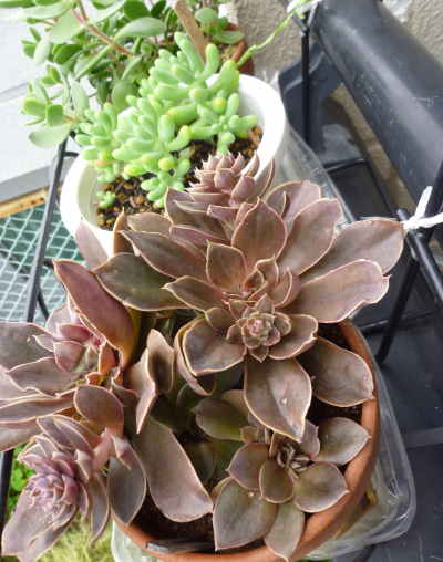 7月に植え替えを兼ねて寄せ植えにしたパープルキング(Graptoveria Purple King・別名:初恋)の開き切った葉が少しだけど起き上がってというか、閉じてきました。 6月末まではもっと引き締まっていたので、梅雨の間に加湿で開いてしまったようです。 (気を付けてはいたけど、ベランダの軒下に下げていた吊りカゴに、ボロハイツの上階から漏れ落ちてくる水滴がかかりまくって無駄に濡れてしまったことがあったので・泣) 徒長してスカスカしているのはどうしようもないけど、これは嬉しい出来事。 角度が違うのでわかりにくいけど...