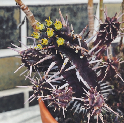 元々は緑色の幹でしたが、いつからかこんな色味に変わってしまい、よりモンスター感が増しているユーフォルビア・フェロックス。こんな見た目でも花は咲きまして、これが満開の様子。さり気ないです。 5、6年前に購入した際は、まったく予備知識もないまま1年中屋外で育てていました。毎年花も咲いているし、小株も増えているし、育て方を疑うこともなく今でも1年中ずっと外で過ごしています。 ただ最近、"基本的に寒さに弱い"と書いてあるサイトが多いことに気づきました。5度を下...