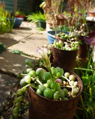 JUGEMテーマ:多肉植物 これは緑のルビーネックレス。 ガレージの中の明るい半日陰で、霜も当たらないせいか緑ですね。 花が咲きそうです。 ルビーネックレスの特徴の茎が紫なのが分かりますか。 こんな高くまで首を伸ばして、細い茎でがんばっています。 葉っぱと同じ高さでなぜ咲かないんだろうね? 株分け...