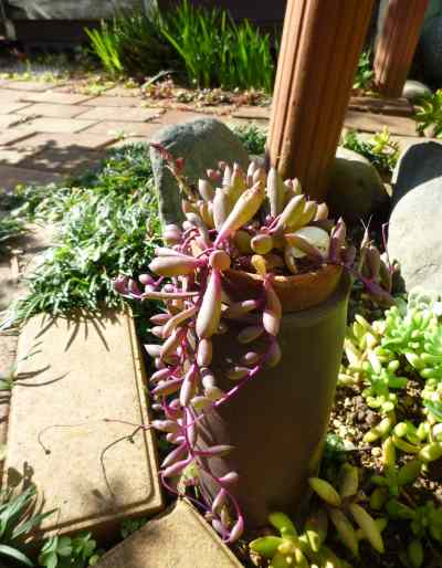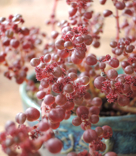 JUGEMテーマ:多肉植物 赤くなってきたルビーネックレス。 陽当たりのいいところから赤くなっている。 近寄って見るとこんな感じ。 茎は紫。 これは花のつぼみ。 先まで力が入っている。 小さな菊のような花。 グリーンネックレスは白い花だけれど、こっちは...