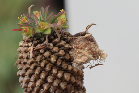 JUGEMテーマ:多肉植物 水やりをしていると、ふと何かの気配。。。 みると小さなカマキリが孵っていました。 春がスタートしています 産み付けられたカマキリの卵は、卵嚢(らんのう)とか卵しょうとかいうらしい。 近くには小さなカマキリが隠れていました。 ソテツキリンはパイナップルコーンともいい、中々ユニーク。 茎?は茶色になってますが、花が咲いてました♪