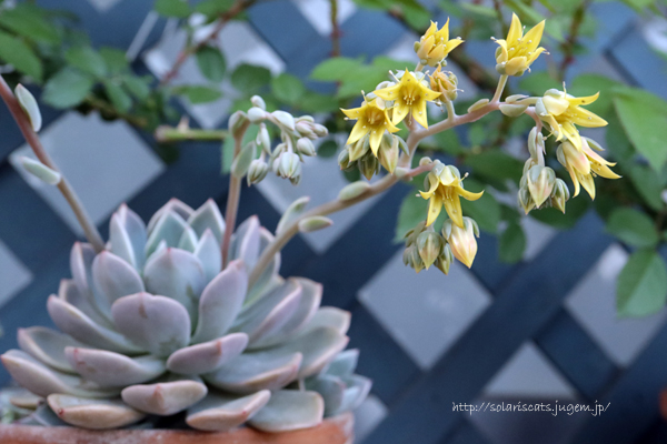 忙しかったのと風が強い日が続いていたのとで、だいぶ後回しになっちゃいましたが 3/6のピンクプリティの花芽は、4月に入ってからしっかり黄色いお花を咲かせました。 名前はピンクでも、花はピンクじゃないのね(笑) 4/4の名無しエケベリアと比べると、同じ黄色でもだいぶ印象が違います。 あちらは丸みがあって、鈴なりに連なって咲く姿がとってもキュート。 こちらはいろんな方向を向いて咲くせいか、なんだかもっとにぎやかというか。 ...