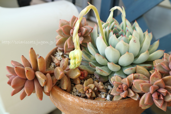※びろんびろんに伸びきって倒れてるブロンズ姫はスルーしてください…(/ω\) ぐだぐだ地面に近いところで伸びていた花茎がシャキーンと立ち上がったら、開花準備オッケーの合図。 タグなしで購入した名無しのエケベリア、毎年楽しませてくれてありがとう。 伸びているのが2つと、これからのが3つ。 今年は5つ…最高記録。頑張り過ぎやろ。 毎年咲いてて花はもうどんなものかわかっているので、一つだけ咲かせたらあとはカッ...