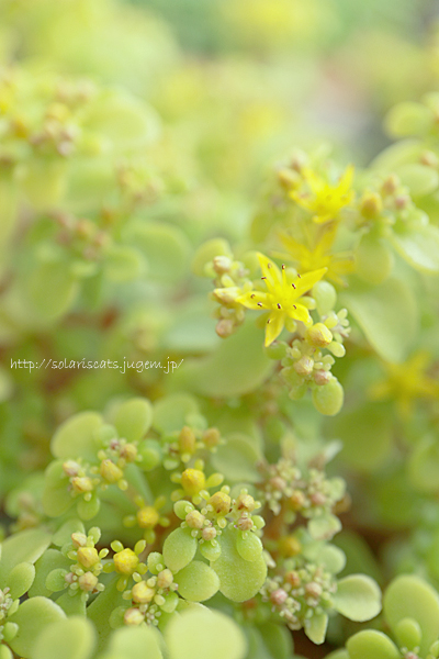 爽やかなライムグリーンの葉が素敵な 黄金丸葉万年草。 4/25の時の様子はコチラ 遠目から見ていて、なんだか今までよりも黄色っぽいな〜?肥料が足りてない?と近寄ってみたら ちいさな黄色い花が咲いていました。だから黄色く見えてたのね。 たくさんのつぶつぶ?の間にすこしとんがった蕾。 どこもかしこもつぶつぶ&とんがり蕾だらけ〜!まだまだたくさん咲きそう。 梅雨前に短く刈り込もうと思ってた...