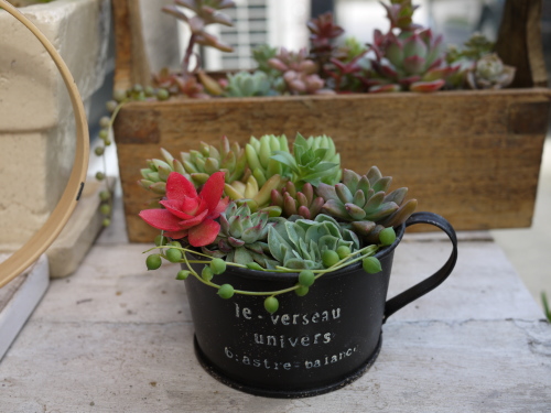 友達へのプレゼント用に多肉の寄せ植えを作りました。 花うらら、火祭り、リトルビューティー、ビアホップ、虹の玉、グリーンネックレスなど。 使ったカップは オーアストルショートピッチャー 大きすぎず小さすぎず寄せ植えが作りやすいサイズでした。 喜んでもらえるかな? あまり多肉に興味がない友達なんだけど、「欲しい♪」って言ってくれたんです。 これを機会に、タニラーになってくれたらいいのにな〜。 やっと...