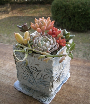 JUGEMテーマ:多肉植物 朽ちたような土くさい風合いと傾きや イビツにゆがんだその姿が絶妙なバランスの アンティークポットのご紹介です。 土の感触をわざと残したからこそにじみ出る自然で独特な質感は、 成形と焼き締めを終えた状態で沼地に一定期間浸けこみ、 その表面にわざと自然のコケを付着させることでようやく完成します。 年月を経ることで変化する自然の風化に加え、 植え込んだ植物に与えた水により付着したコケが新たな変化を見せ、 ポットの表面に独...