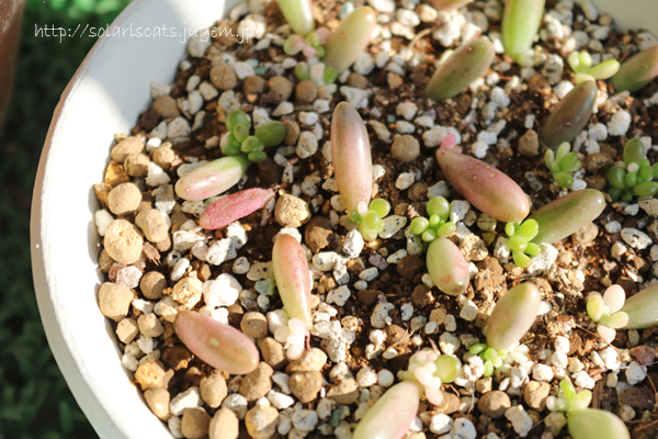 9〜10月に葉挿ししてたオーロラの様子です。 8〜9月の雨と日照不足でびろんびろんに徒長したやつの葉っぱをもいで 以前書いた葉挿しのやり方で根を出してから土に挿しました。 ちびっこたちがぷくぷく成長中。 ベランダに出しっぱなしで雨に濡れたりしたのでダメになったやつもいくつかあるけれど うちのベランダは日当たりがよく土の渇きも早いおかげで、あまり根腐れしないありがたい環境です。 ※ただし夏は遮光しないと西日で焼け焦げる ...