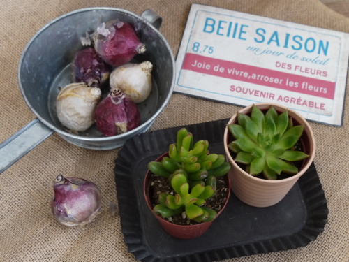 先日、やっとヒヤシンスの球根を買い求めました。 確か去年も出遅れて、あちこち探し回って、ようやく最後の最後の残り物の球根を買うことができたのでした。 今年もそんな感じ(^▽^;) 久しぶりに園芸店に行ったら、ついつい多肉売り場も覗いてしまって久々の購入です。 見るとやっぱり欲しくなる〜。 ヒヤシンスは白とブルー系。 そろそろ水栽培、始めなくちゃ。 多肉は左がホービット、右がジェイドポイント。 ジェイドポイントのほうは紅葉するらしいんだけど...