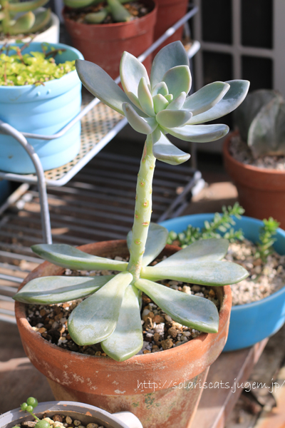 JUGEMテーマ:多肉植物 こちら、白牡丹(親株)さんです。 真っ直ぐ上を向いていない・・・ けどまぁ順調に育ってることは確かです。 たにこさんにプレゼントして頂いて このベランダに仲間入りした時は、 もんのすごく小さかった白牡丹さん。 そんな白牡丹さんは少しずつ成長して 子株が顔を出したので親株と分けました。 そして、徒長した部分をカットして 形を整えるべく新しい鉢で親株を育て、 それから約2ヶ月が経とうとしてる現在。 徒長せずに少しずつ少しずつ育ってます。 新しい鉢に...