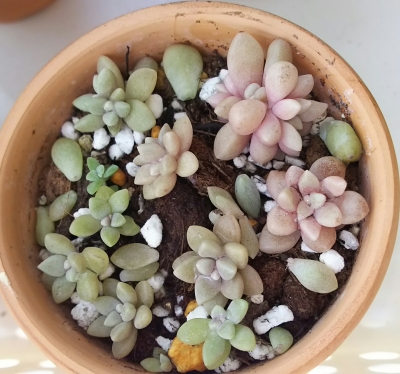 漢字表記はお店によりバラバラな姫シュウレイさん。 個人的には姫愁麗がお気に入り(*^ー゚) この子もお店によってどうも違う… ピンクの二人はこないだヤフオクのカット苗に入ってた子。まだ発根してないのに水やりされているから腐るかも😱 でも素焼き鉢&日向なので毎日霧吹きしてます💦 同じポットで売られてた子はこちらにも。広めに植え付けているとどんどん増えるいい子。 寄せ植えに毎回入れられてます。ピンクになったらめっちゃ可愛いものー♥ で、問題の子はこちら、ハニーミン...