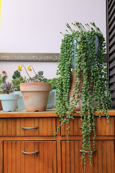 こちら、我が家のベランダにいるグリーンネックレスその他。 この棚は主に高さがある多肉とモケモケ毛が生えてる奴らを並べていて 【胡蝶の舞】【花月錦】【銀揃】【熊童子】【アロマティカス】 それと、グリーンネックレスの後ろに隠れてて写ってないけど【黒法師】がいます。 花が咲いたエケベリアたちも、高いところにいてくれたほうが写真が撮りやすいので こちらに移しました。 先日の宝樹がバラの鉢まわりの多肉コーナーの主だとしたら グリーンネックレスは、この多肉棚の主ってカンジ。 こちらも負けず劣ら...