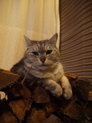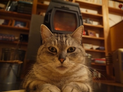 薪ストーブの前でお手手をそろえて、 落ち着いているように見えますが、 じつは、ちょっとピリピリしています。 なぜなら――、 その視線の先には、例の...... 例の...... ち、近い! ゴングが鳴った?! ド キ ド キ ド キ ・ ・ ・ &...