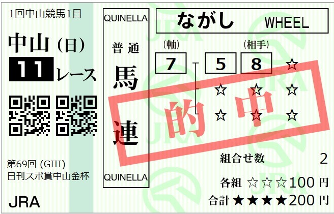 JUGEMテーマ:雲蒸竜変 今年も金杯から競馬が始まりました! 中山金杯で馬連的中。(^_^) しかし京都金杯は、1着馬、2着馬は買っていたのですが、本命馬が5着で馬連、3連複ハズレ・・・ 今日のトータルはマイナスでしたが、とりあえず初日が出たので良しとします。(^^) さて、明日からいよいよ2020年の仕事始めですね。 この休みの間、起床は早くて8時、正月3日間は9時過ぎでしたので、明日6時に起きれるか心配です。(^_...