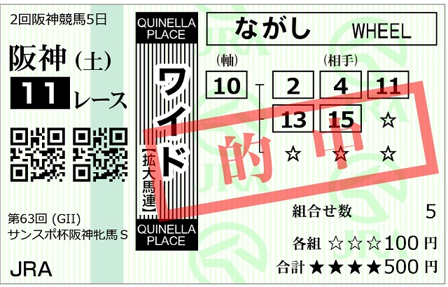 JUGEMテーマ:雲蒸竜変 昨日の阪神牝馬Sで1着2番人気?サウンドキアラ、2着6番人気?スカーレットカラー そして3着に軸にした11番人気?ディメンシオンが入って、私のワイド馬券2点的中! しかも?−?が万馬券でした。(^^) ワイドの万馬券はめったに出ないので、的中すれば気持ちいいですね。(^^) さて、これから今日の桜花賞の馬券予想をしていこうと思います。 なんか堅く決まりそうですが、雨で湿った馬場になれば、荒れるかも...