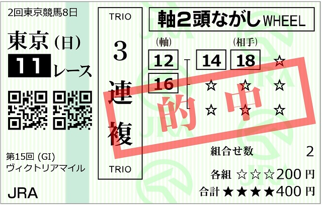JUGEMテーマ:雲蒸竜変 先週の東京連続G?2戦目のヴィクトリアマイルを優勝したのは、C.ルメール騎乗の もちろん1番人気の?アーモンドアイでした! 2着は4番人気?サウンドキララ、3着に?ノームコアで私の馬券ですが、 安い配当ですが3連複を的中。(^_^) 惜しかったのは、何とかアーモンドアイを入れて万馬券を狙いに3連複でアーモンドアイの相手軸として 12番人気?トロワゼトワルを買いましたが、4着となり3着に着...